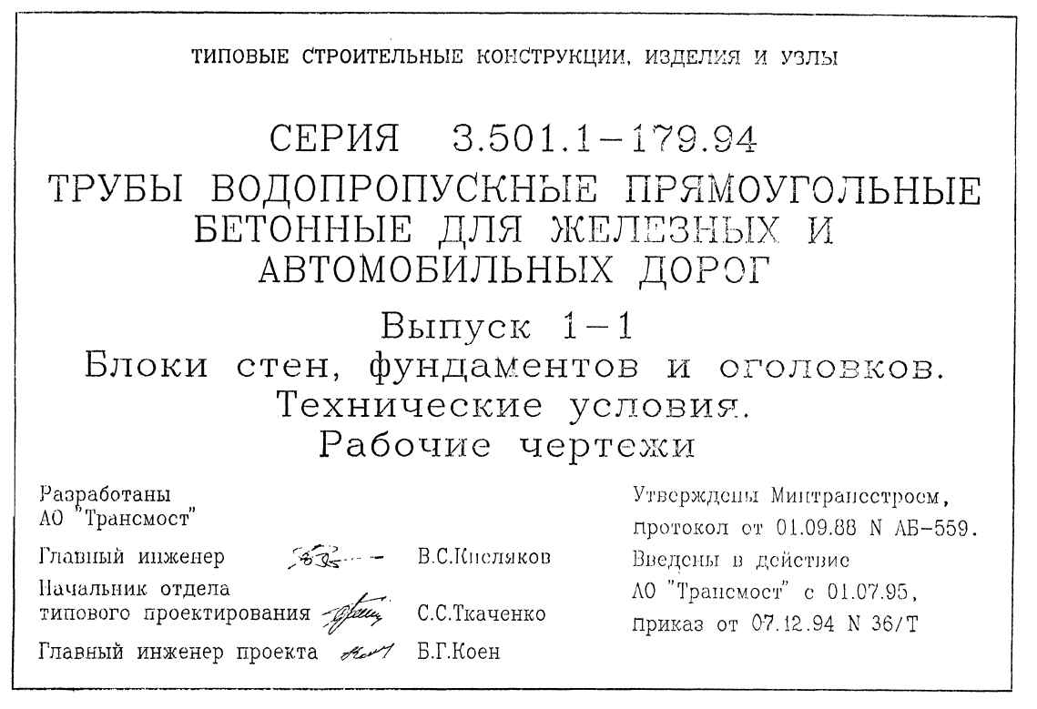Серия 3.501.1-179.94. Трубы водопропускные прямоугольные бетонные для железных и автомобильных дорог