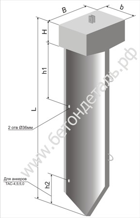 Фундаменты трехлучевые с анкерным креплением консольных опор контактной сети ТАС 4.5 представляет собой столбчатый фундамент с заостренной подземной частью в виде трех лучей, и верхней частью, изготовленной в виде стакана квадратного сечения с цилиндрической внутренней частью. Данные фундаменты применяются, при установке опор контактной сети на различных участках железных дорог.